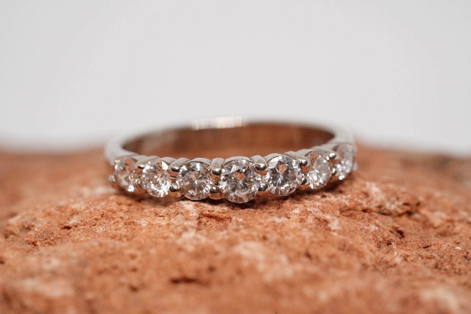 A stunning 18ct white gold ring featuring seven gorgeous diamonds. Central diamond approx 0.17 cts, bordered by two approx 0.14 cts, two approx 0.10 cts and two 0.8 cts diamonds respectively.