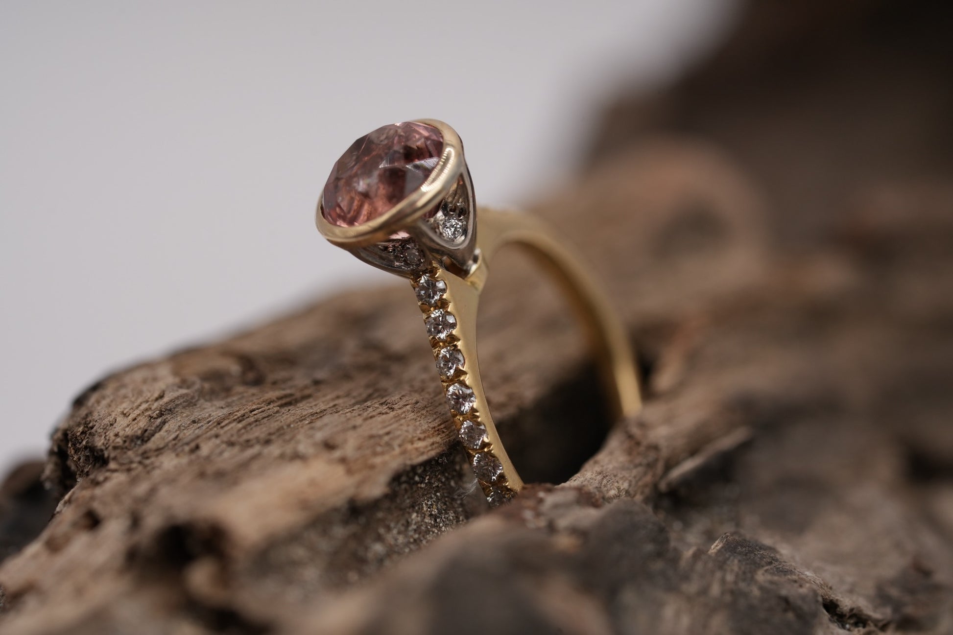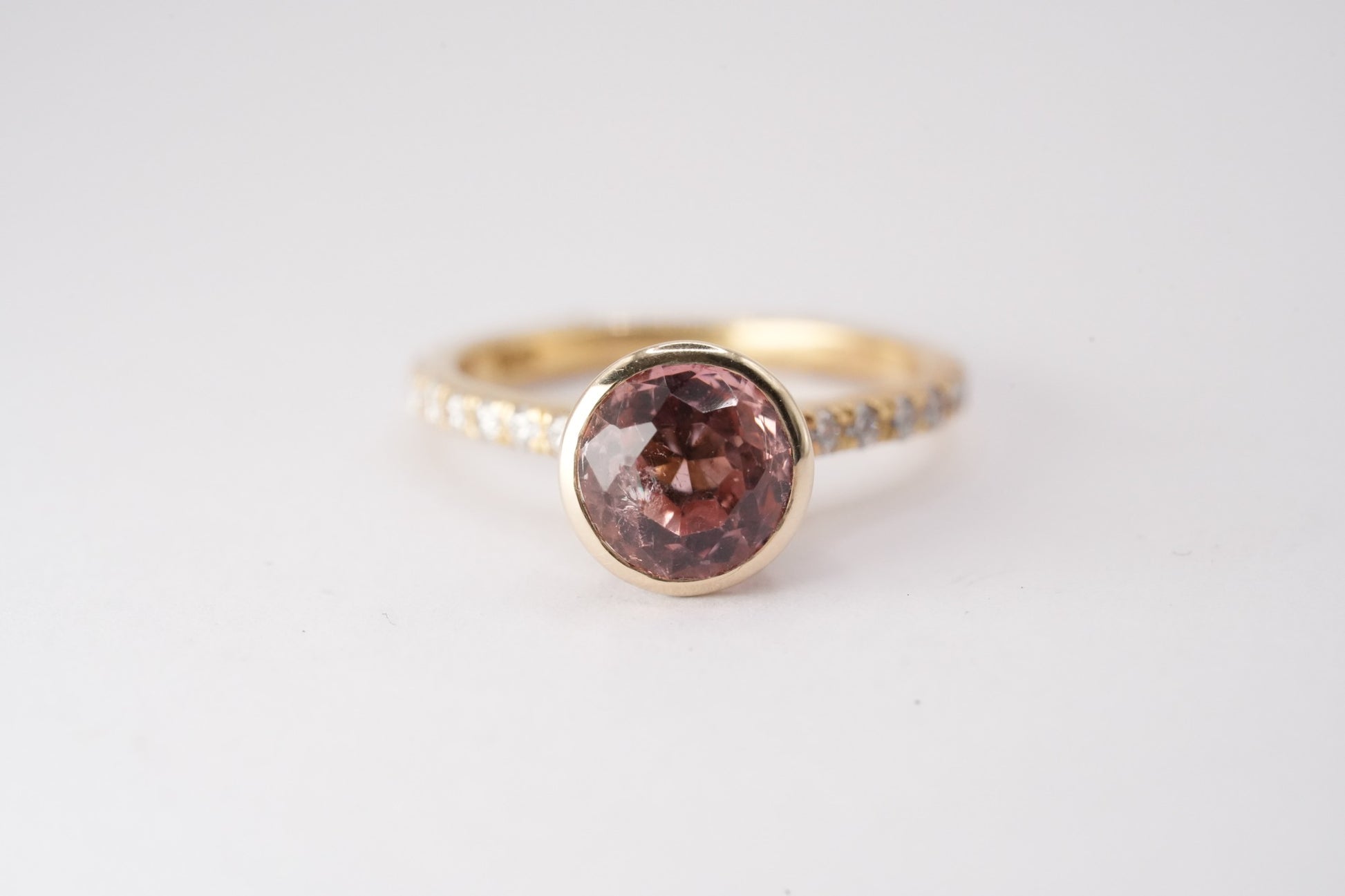 18ct yellow gold modern ring, rub set with a central old round brilliant pink tourmaline approx 1.1ct.