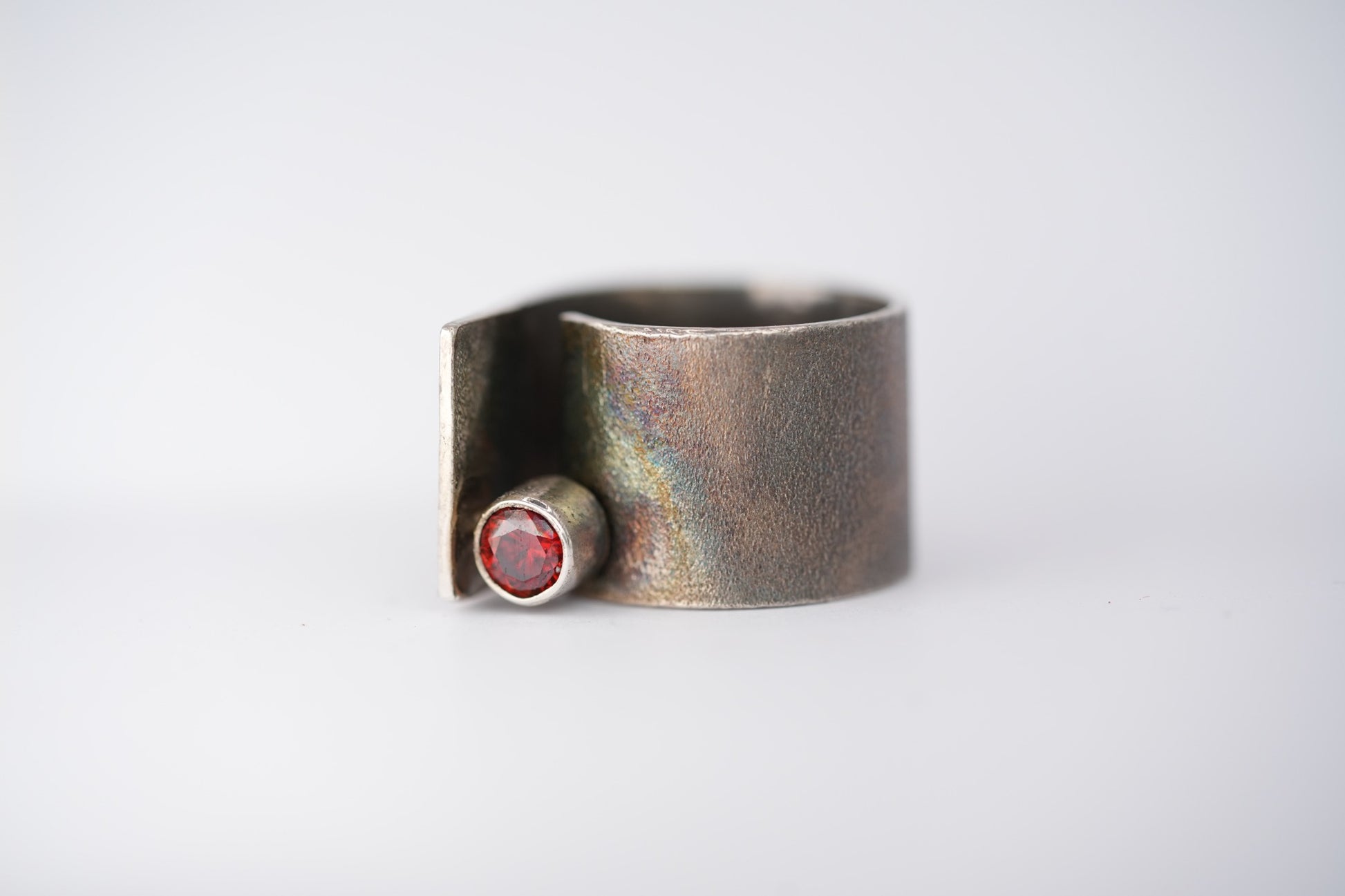 Garnet, with its deep crimson hue and historical significance as a symbol of passion and protection, pairs beautifully with sterling silver in this refined ring. The gemstone's rich colour creates striking contrast against the metal's lustrous finish, while its durability makes it suitable for everyday wear. This piece combines timelessness with the grounding energy garnet is traditionally believed to provide, making it an excellent choice for those seeking both aesthetic appeal and meaningful jewellery.